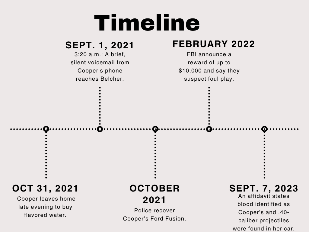 In September 2023, a court affidavit signed by a Columbus police detective and reviewed by the family stated that blood and .40-caliber projectiles were found in Cooper’s recovered vehicle and that testing identified the blood as belonging to Cooper. The affidavit also identified Roger Smith Jr. as a person of interest in Cooper’s earlier missing-person case and said a .40-caliber handgun seized during an unrelated search would be compared with evidence from Cooper’s car.